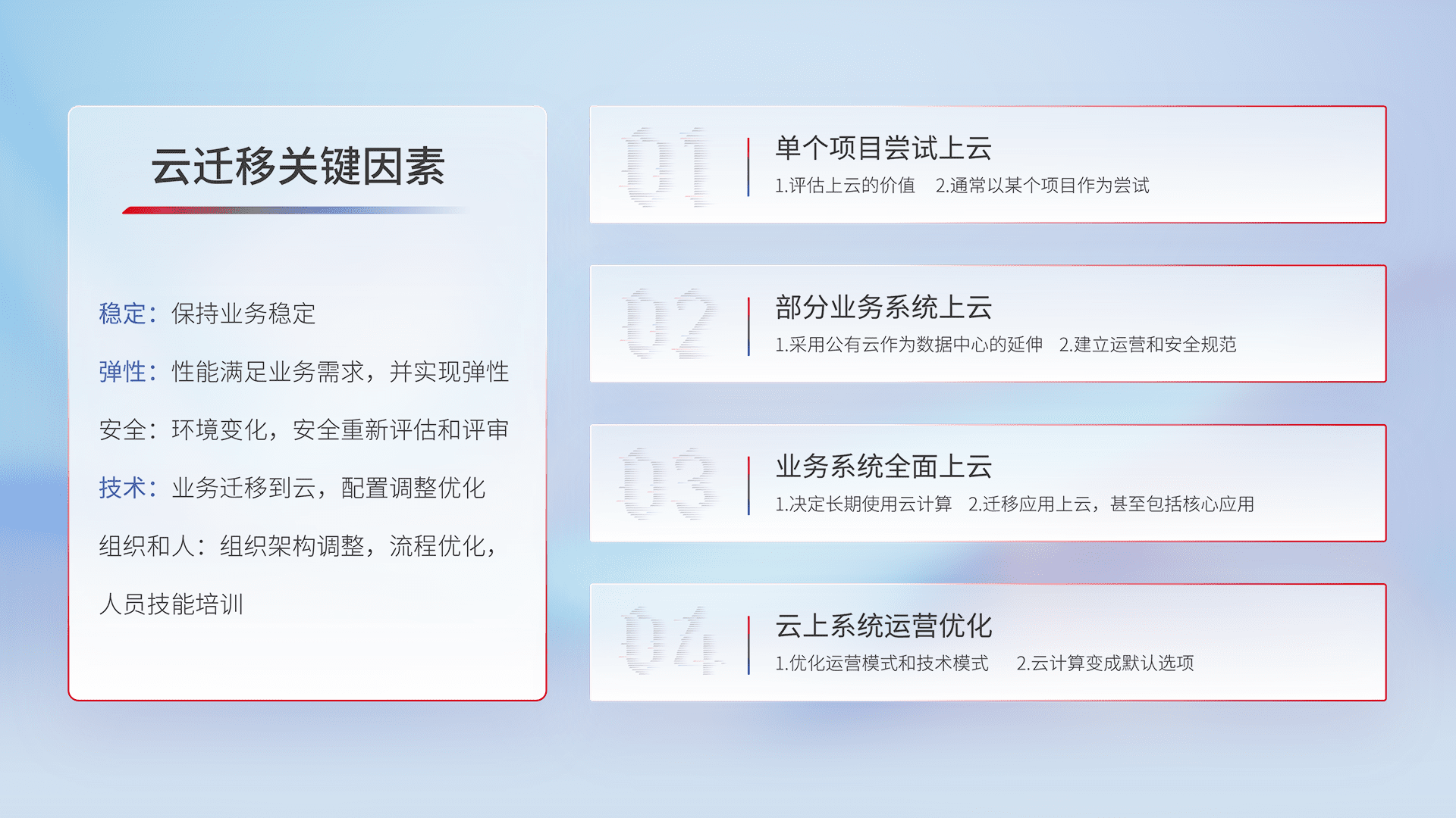 结合实际业务,,,从规划设计、、、云平台选型、、、云原生改造、、、数据迁移、、、集成交付,,,,迁移全过程为客户识别最佳上云路径,,,,做好风险识别管理,,,,设计网络架构、、、身份权限、、、安全审计合规、、、、操作审计、、日志审计、、、监控告警策略、、、多站点容灾设计等,,,对云上基础设施进行整体规划,,,,提升IT治理水平,,,,以满足弹性、、高可用、、、、高性能的需求。。。