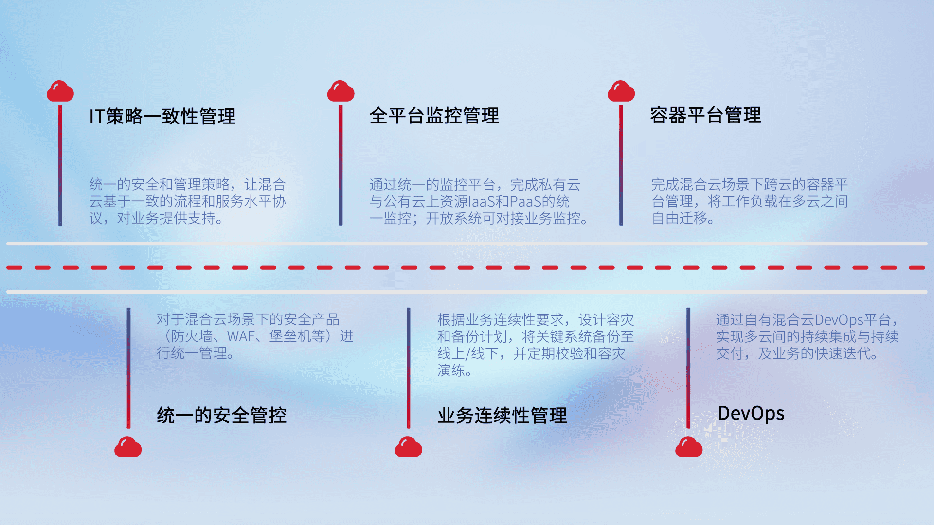 通过多云纳管,,,,以统一的资源数据模型把客户的云资源进行抽象和封装,,进而实现对多云资源的统一操作,,,,保障云资源管理的可靠性、、稳定性与可用性。。。。量身定制化运维内容,,配置、、、开发运维、、补丁管理、、、、备份、、、、监控、、、、认证和访问管理、、审计和日常巡检等,,保障在用云过程中的可靠度,,,,稳定度以及高可用率。。